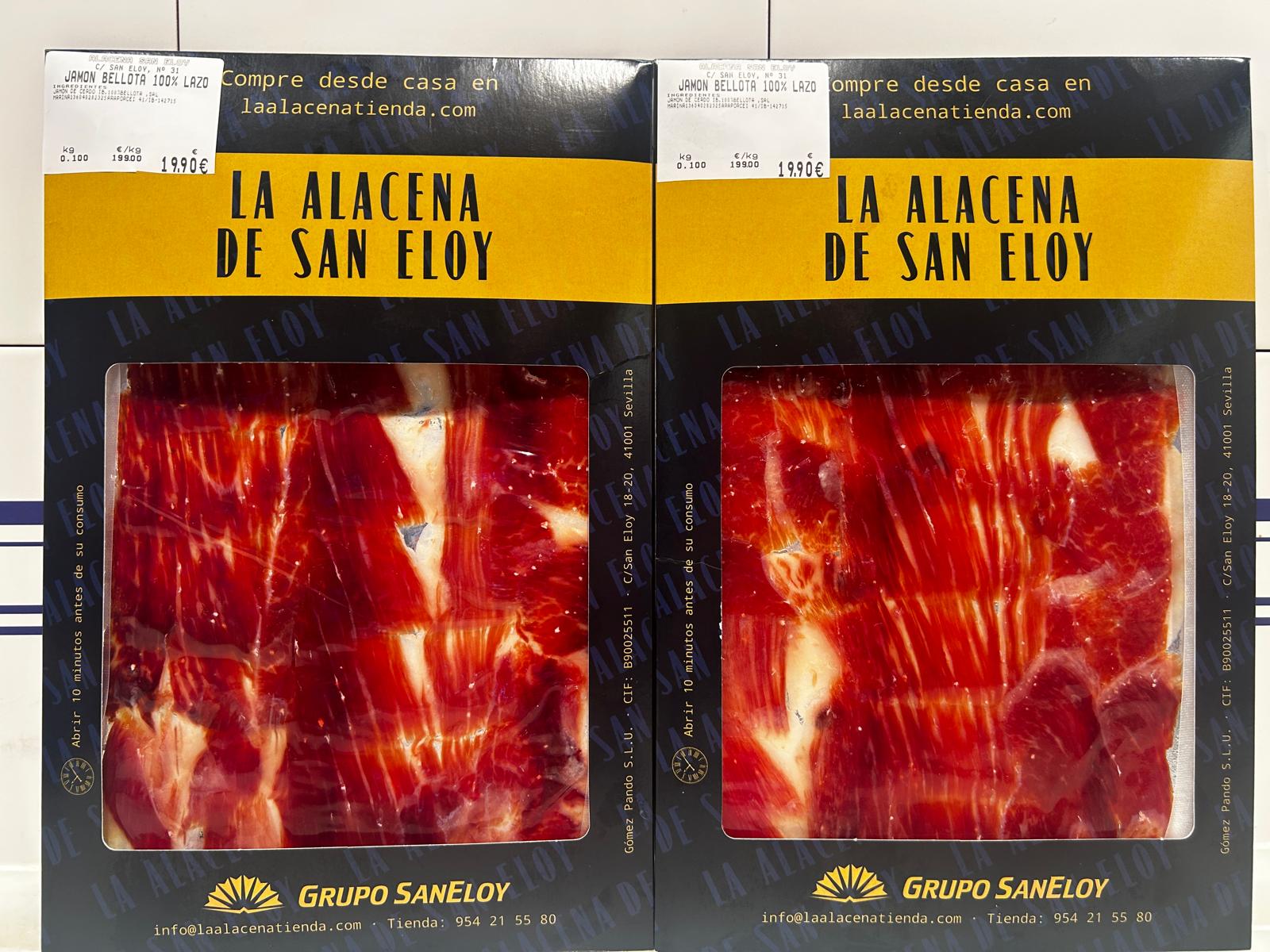 OFERTA JAMÓN 100% IBÉRICO BELLOTA LAZO CORTE CUCHILLO 2 PAQUETES DE 100GR.