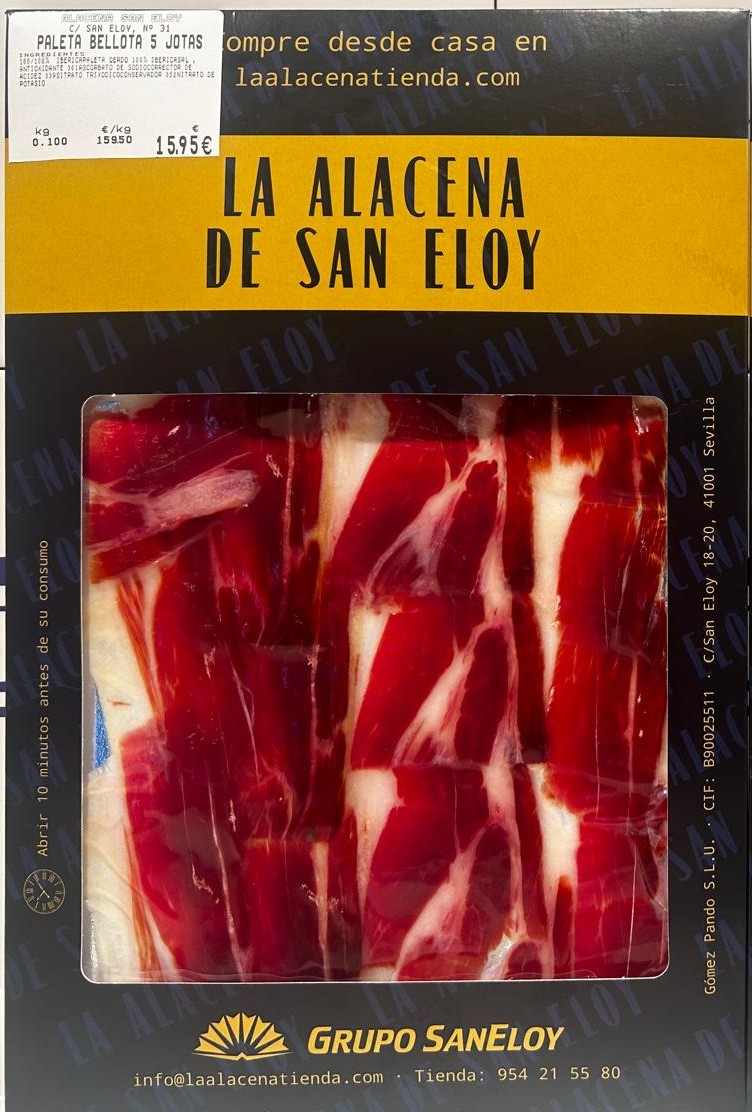 Ingredientes: paleta de cerdo 100% ibérica, sal marina, antioxidante E-301(ascorbato de sodio), corrector de la acidez E-331(iii)(citrato trisodico) y conservador E-252(nitrato de potasio).